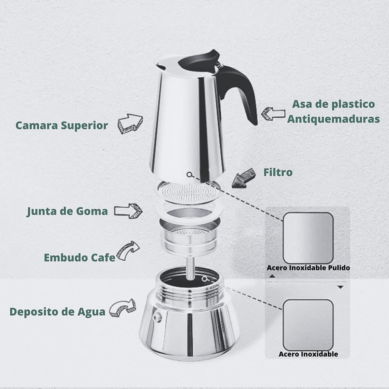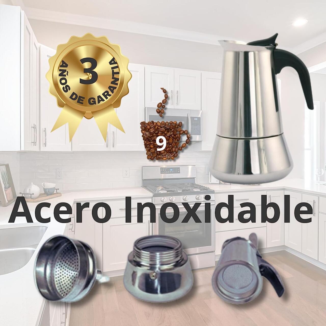 Cafetera italiana de acero inoxidable para 9 tazas de café. Base ancha que permite mejor conexión en placa inducción, compatible con vitrocerámica y cocina de gas.La capacidad de la cafetera manual de 9 tazas café.Cafetera Italiana De Acero Inoxidable es "ANTIDROP" - no gotea al servir el café.